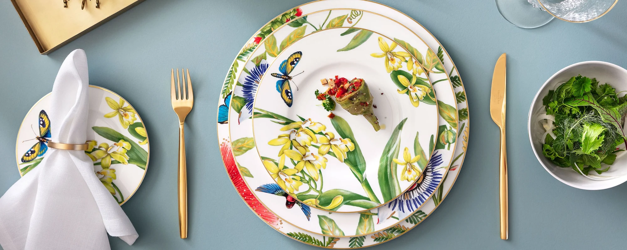 Het tijdloze servies van Villeroy & Boch Amazonia betovert met de kracht van het tropisch regenwoud en brengt de levendige kleuren van orchideeën, kolibries en passiebloemen naar een niveau dat mensen met een passie voor uitzonderlijk porselein en luxueus vakmanschap inspireert.