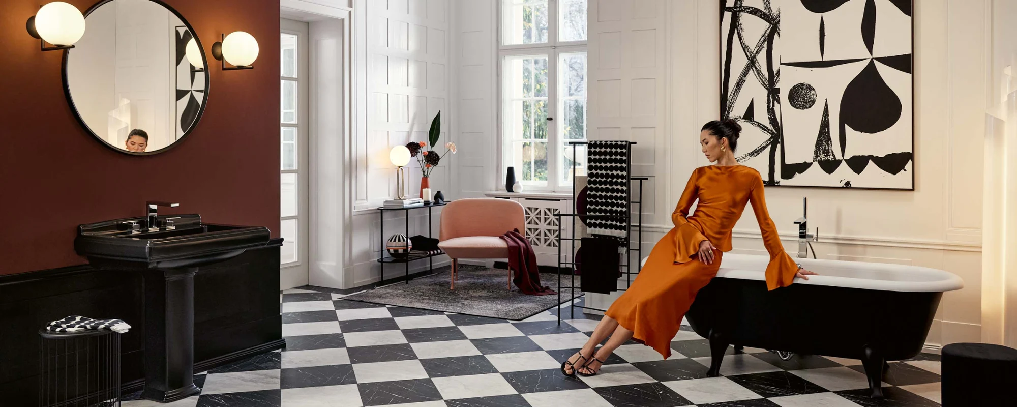De collectie Hommage wordt gekenmerkt door indrukwekkende rechte lijnen: met reliëfs op alle keramiek en de exclusieve accenten en hoogwaardige details, zoals de gelakte echt houten poten van het bad, fascineert Hommage door zijn hoge kwaliteit.