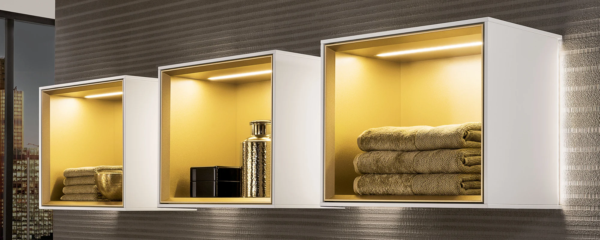 Open badkamerplanken bieden flexibele opbergruimte, creëren decoratieve accenten en zijn eenvoudig achteraf te monteren. Binnenverlichting benadrukt details en individueel selecteerbare kleuren passen perfect in het badkamerontwerp.