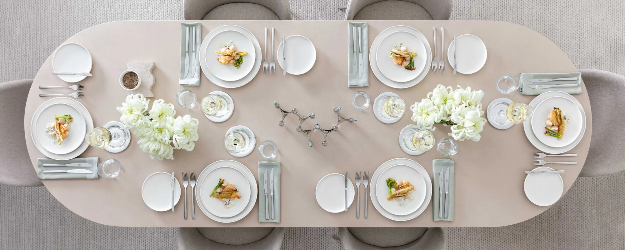 Elegantie is een houding. Een stijlvol gedekte tafel wordt een symbool van waardering en hoogwaardigheid. De nadruk ligt op heldere lijnen, doordachte composities en details die enthousiasmeren en indruk maken dankzij hun evenwicht tussen esthetiek en verfijning.